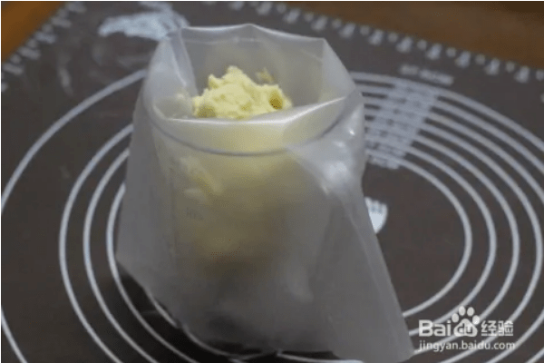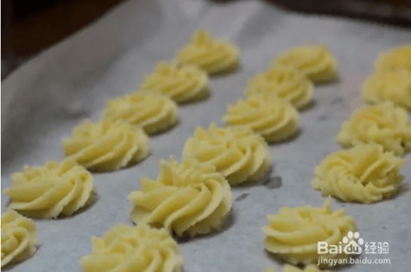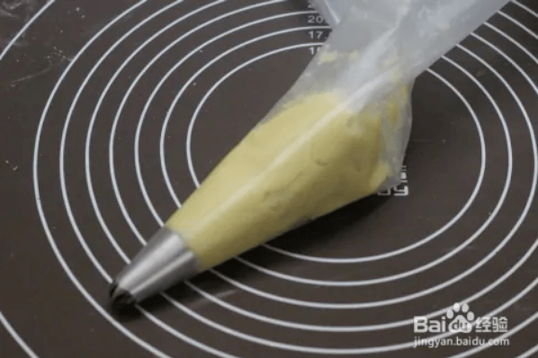 取一部分面糊,放入硅膠裱花袋中。把面糊擠到裱花袋前面,使用中型八齒菊花嘴將曲奇面糊均勻地?cái)D入烤盤。